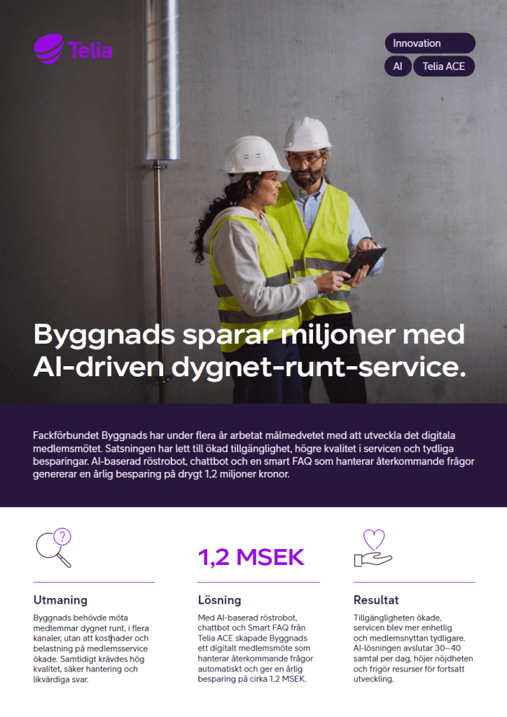 The Swedish trade union Byggnads has, for several years, worked with a clear aim to develop the digital member meeting experience. This commitment has resulted in improved availability, higher quality of service, and clear cost savings. A virtual voice agent built on generative AI, a chatbot, and a Smart FAQ from Telia ACE that handle recurring questions around the clock generate annual savings of just over 1.2 million SEK.